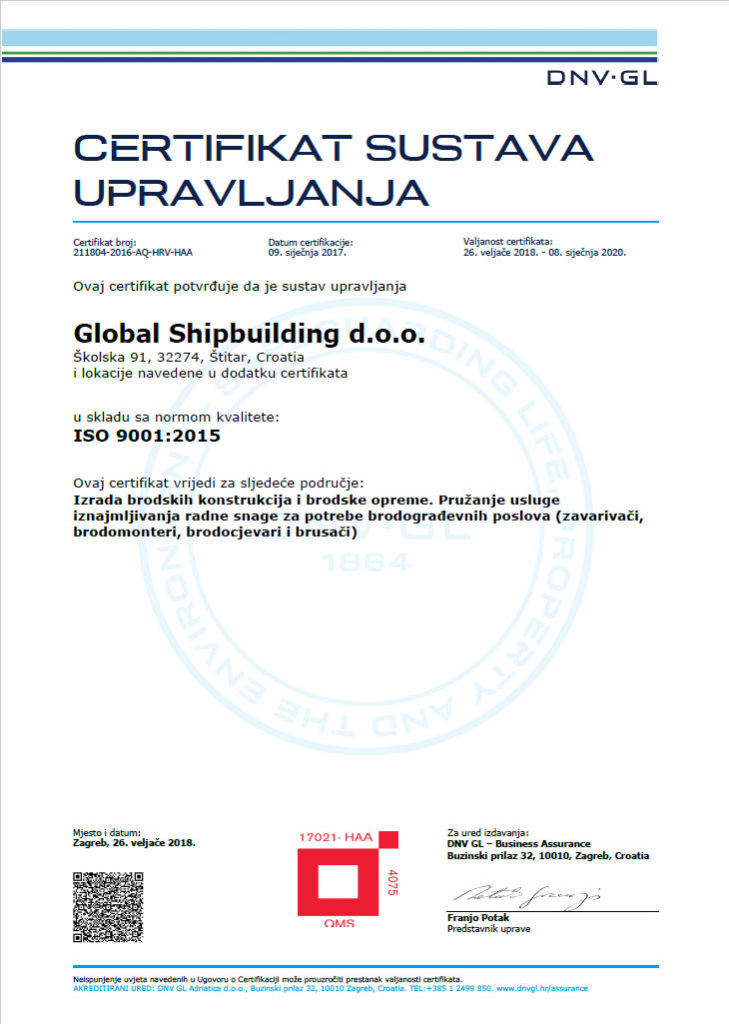 U skladu s našim željama za postizanjem vrhunske kvalitete naših usluga i proizvoda, odlučili smo napraviti certifikat sustava upravljanja pri certifikacijskom društvu DNV GL te smo 9. siječnja 2017. dobili certifikat u skladu sa normom kvalitete: ISO 9001:2015.